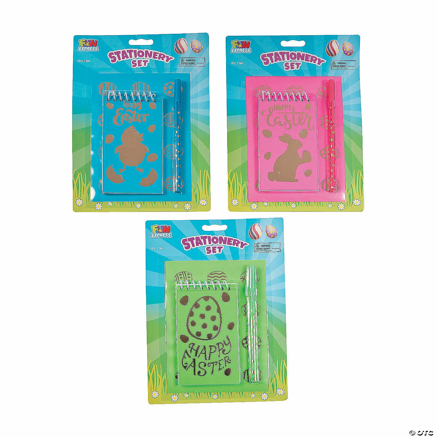 These stationery sets make for great Easter basket stuffers or prizes at an Easter egg hunt.• Assorted.• Material: Paper and plastic.• (3 pcs./set, 12 sets/unit)• Size: Sticker sheet, 5″ x 6 3/4″; notepads, 3″ x 5 1/4″ 30 pgs; pens, 5 3/4″.• Retail-Ready