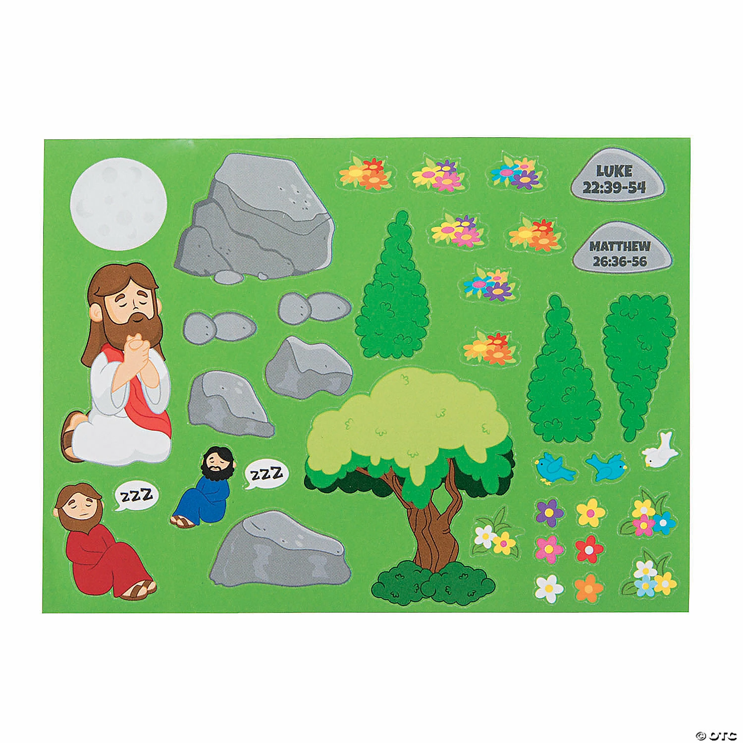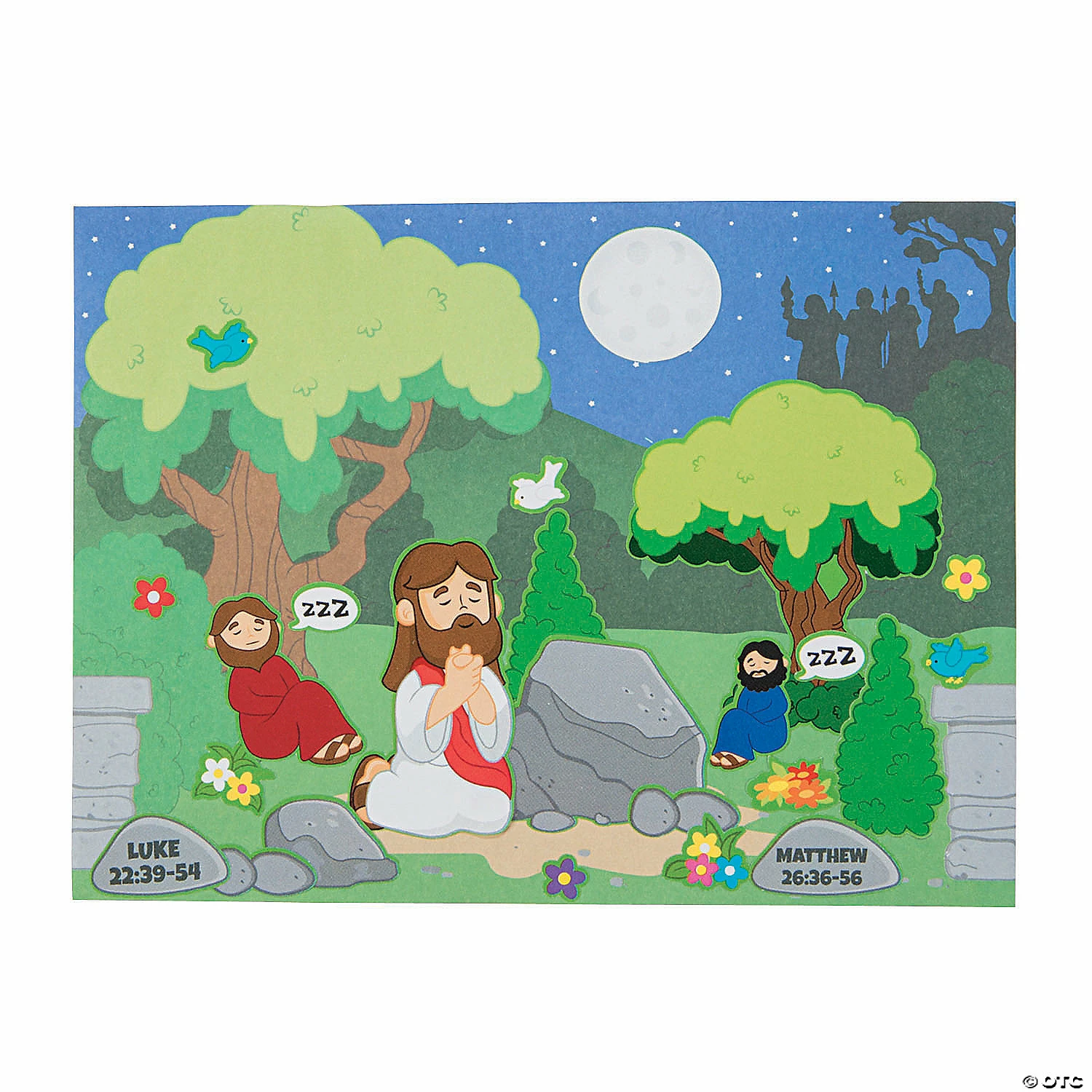 Give Sunday School and religious education students a great visual aid for events after the Last Supper with these Jesus in the Garden Mini Sticker Scenes. A fun addition to Sunday School supplies, these scenes let little ones create their own vision of Jesus praying in the garden while his closest friends slept. Find more Holy Week crafts and activities elsewhere on this website. Includes 12 sticker sheets and 12 backgrounds. Paper. 6 1/2″ x 4 3/4″ ยฉย OTC