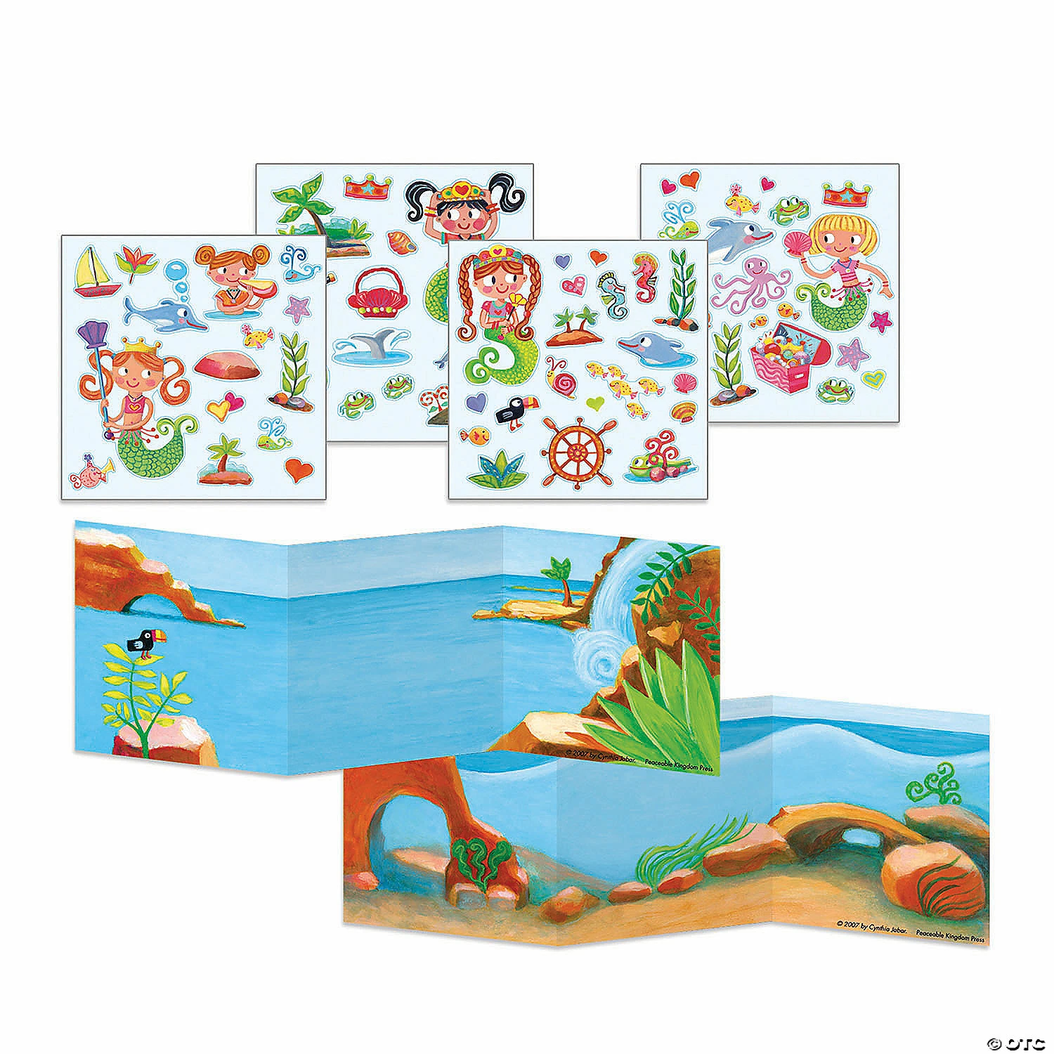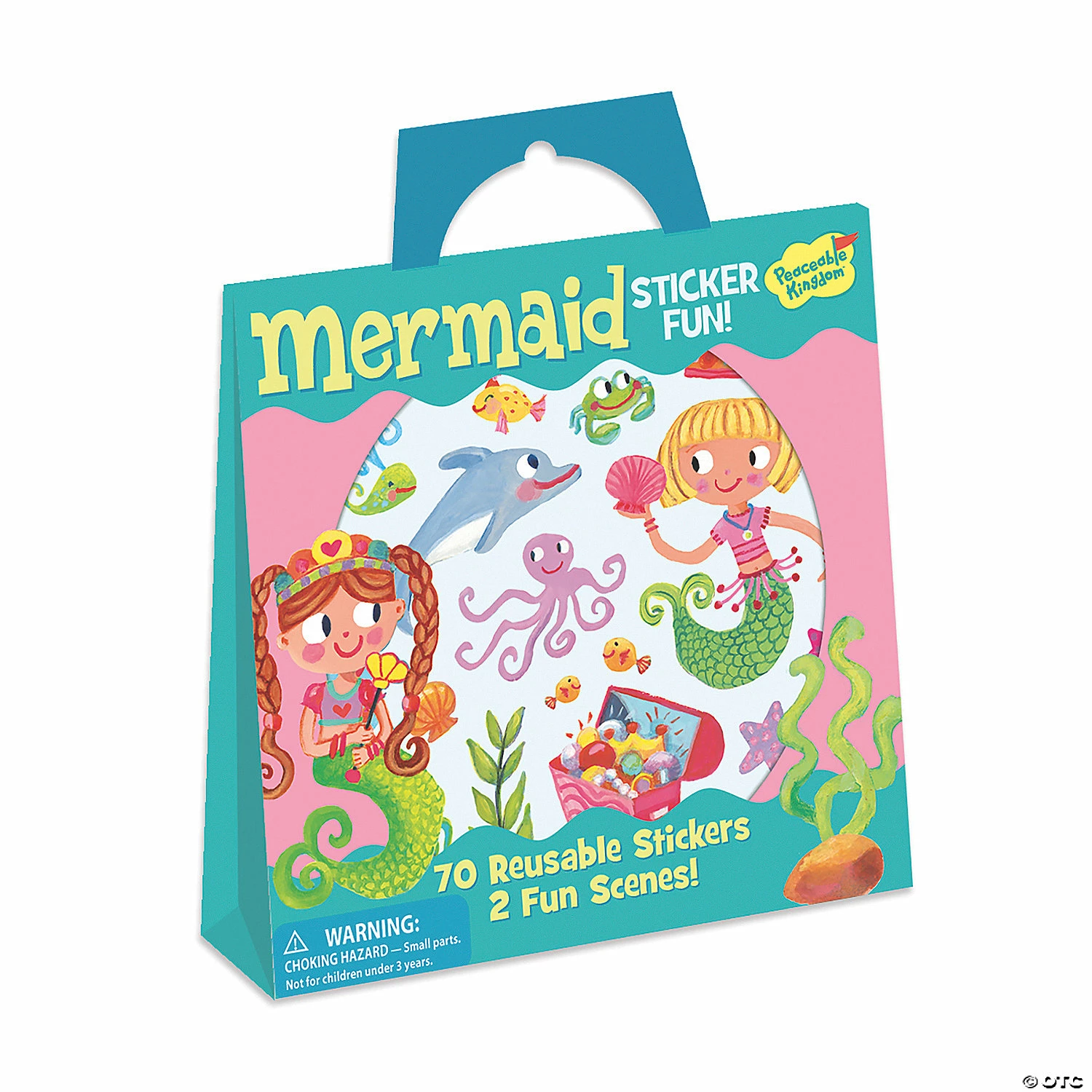 Peel off these reusable mermaid themed stickers and put them anywhere on your play scene! If the stickers lose their cling, just rub them in your hair to bring it back! Take this item in the car, on a plane, into a restaurant, or anywhere you might want an engaging activity thatโs easy to start, easy to clean up, and reusable. Just toss everything back into the handy carry-along tote. Play for a few minutes or a few hours and learn hand-eye coordination and imaginative play!